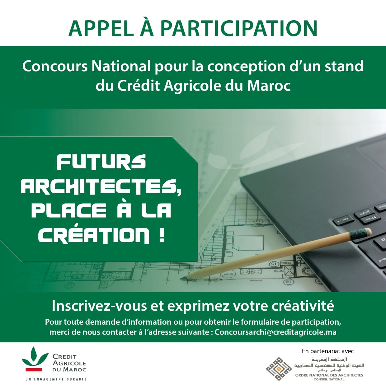 Dans le cadre de son engagement en faveur de la jeunesse et de la valorisation des talents créatifs, le Groupe Crédit Agricole du Maroc, en partenariat avec le Conseil National de l’Ordre des Architectes, organise un concours destiné aux étudiants marocains en architecture. Les participants auront l’opportunité de concevoir un stand et de valoriser leur créativité dans un projet à forte visibilité institutionnelle.
